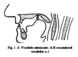 La vocalele anterioare sau prepalatale (fig. 6.); rezonatorul se formeaza intre partea anterioara a limbii si partea anterioara a palatului; dosul limbii, ridicandu-se spre partea mijlocie a palatului, lasa un spatiu liber, mai mare, in partea anterioara a cavitatii bucale, spatiu unde se formeaza rezonatorul vocalelor anterioare e, i.