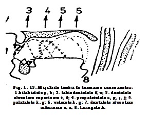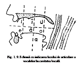 O sinteza a celor aratate mai sus ne ofera fig. 9., care este de fapt o schema cu indicarea locului de articulare a vocalelor in cavitatea bucala.