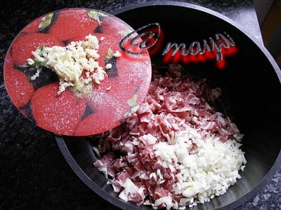 Intre timp,taiati costita feliute,tocati ceapa si le puneti impreuna la prajit cu 2-3 linguri ulei de masline.