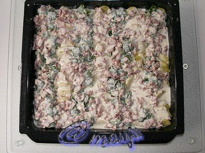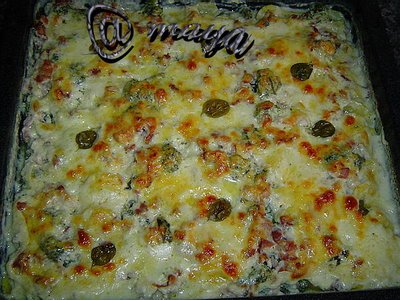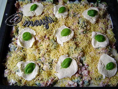 se presara cascaval ras(Gouda am pus eu),si se decoreaza cu felii de