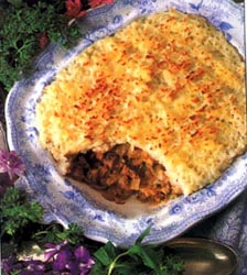 Ingrediente (pentru 6 persoane): 750 g carne de manzat sau de miel fiarta, 25 g unt, 2 cepe potrivite (taiate marunt), 1/4 ceasca faina, 1/2 lingurita faina de mustar, 1 1/2 cesti zeama concentrata de pasare (Knorr+apa), 1/4 ceasca menta taiata fasii, 1/4 ceasca patrunjel verde tocat, 1/2 lingurita piper macinat, sare, 2-3 linguri sos Worcester. Pentru stratul de cartofi: 4 cartofi (mari) fainosi, fierti si presati, 1/4 ceasca lapte fierbinte, 30 g unt, sare, piper. Mod de preparare: - Se unge o cratita sau o forma de budinca (de 2 l) cu unt topit sau cu ulei si se-ncinge cuptorul la 210¡C. Se taie carnea cubulete ori se da prin masina de tocat. Se-ncinge untul intr-o tigaie mai mare si se caleste ceapa, pana ce devine maronie. - Se presara deasupra faina si mustarul praf, se adauga zeama de carne - putin cate putin - si se amesteca bine. Se pune sosul pe foc si se lasa sa fiarba incet, circa 3 minute. Se incorporeaza carnea, menta, patrunjelul, piperul si sarea, se amesteca din nou, se lasa sa se incalzeasca si se toarna in cratita sau forma unsa.- Pentru stratul de cartofi: se amesteca laptele, cartofii, untul, sarea si piperul, se intinde compozitia astfel preparata peste carne, se da budinca la cuptor si se coace 40-45 de minute, pana ce se rumeneste frumos la suprafata.