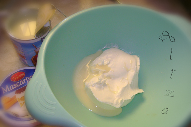 Batem si mascarponele impreuna cu laptele condensat pana devine o crema
