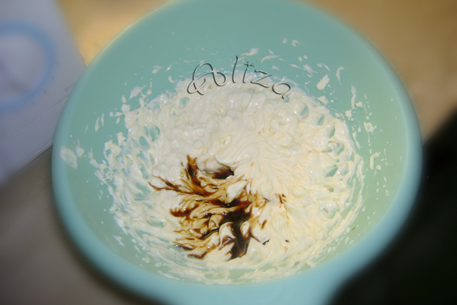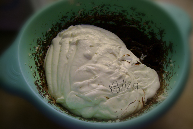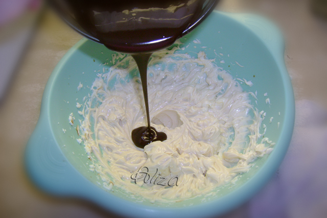 Topim ciocolata amaruie si o turnam incet in crema de mascarpone, amestecam