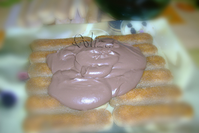 Incepem sa asamblam, asezam un strat de piscoturi pe un platou, le insiropam cu