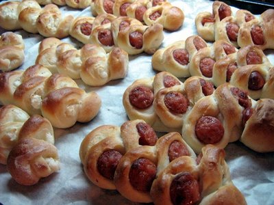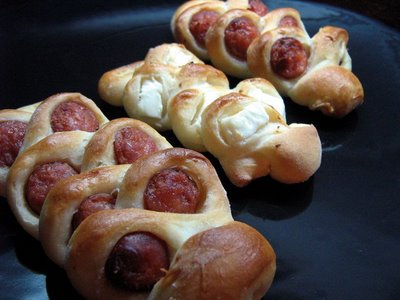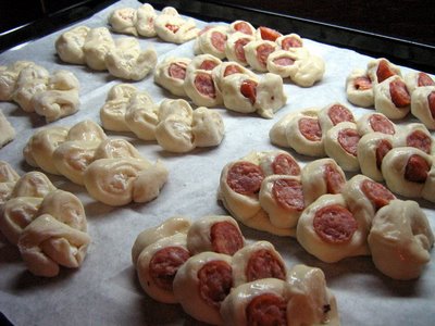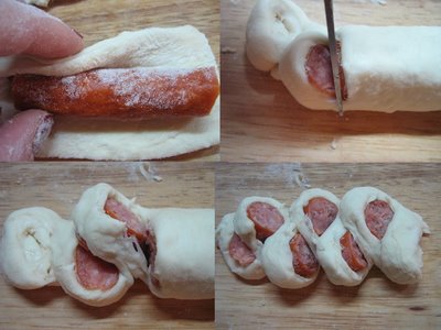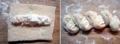 Intindem o foaie cam de 1/2 cm pe planseta tapetata cu faina. Taiem foaia patrate si apoi pe fiecare patrat punem o bucata cabanos . Puteti sa-l lasati la ce lungime doriti, eu l-am taiat in 3. Invelim frumos bucata si apoi o taiem felii cu foarfeca, dar nu pana jos, cat sa se tina in aluat. O bucata o punem intr-o parte, urmatoarea in cealalta parte. Pun poza ca sa va fie mai usor de inteles.
