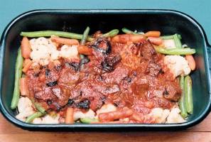 Ingrediente: 800g carne de vita, 150ml ulei, 2 fire mari de praz, 2 cepe, 4 morcovi, 200g conopida, 250g fasole verde, 2 linguri bulion de tomate, 250ml vin rosu, 1 lingura faina, 1 leg. patrunjel verde, sare, piper
