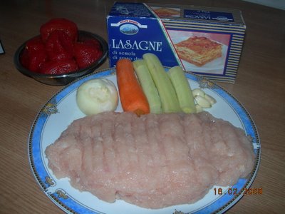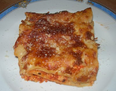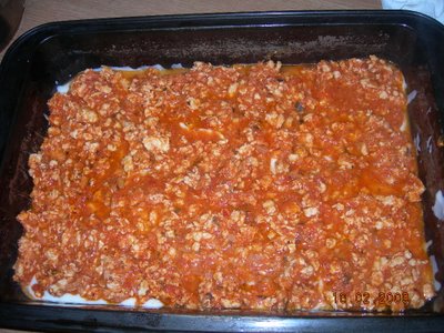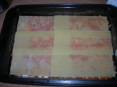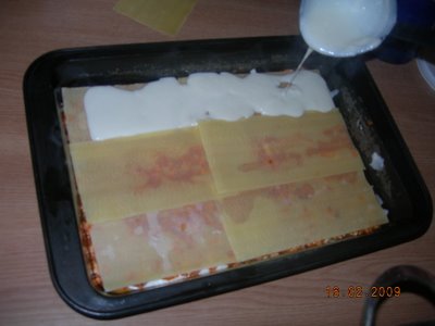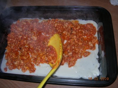 Bechamel, un strat sos Bolognese si se pune primul strat de foi de lasagnia.