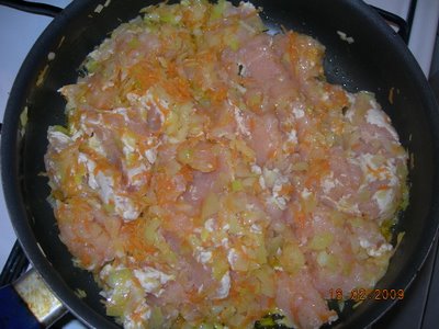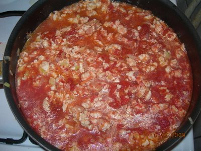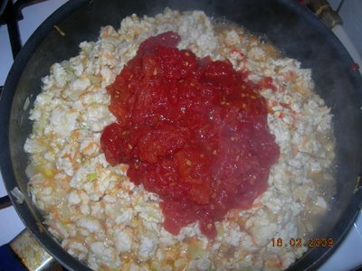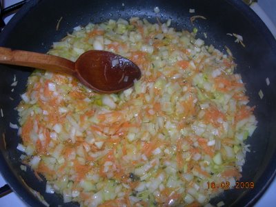 Se caleste ceapa, morcovul si usturoiul, se adauga carnea tocata si se lasa la prajit, dupa care se adauga rosiile. Se adauga doua polonice de apa sau supa de legume si se lasa pe foc timp de 45 de minute. La sfarsit se adauga mirodeniile.