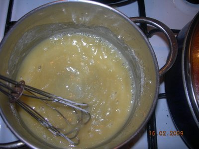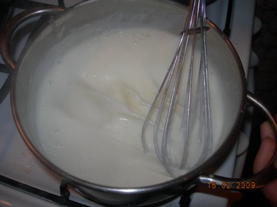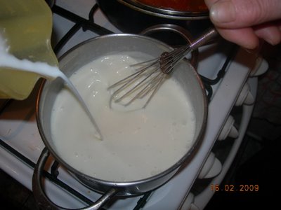 Se pune untul la topit intr-o craticioara si se presara faina mestecandu-se continuu. Se stinge cu lapte putin cate putin si se amesteca continuu. Se condimenteaza cu sare si piper.