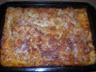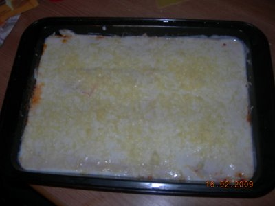 Se continua asezarea pe straturi, iar deasupra se toarna sos Bechamel si se presara cascaval si/sau parmezan .