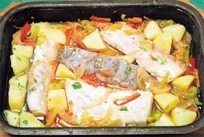 Ingrediente: 1kg stavrid, 100ml ulei, 1 morcov, 1 telina mica, 1 ceapa mare, 4 cartofii potriviti, 2 ardei grasi (rosu si verde), 2 foi de dafin, 1 lingura otet, 2 linguri zeama de lamaie, 100ml vin alb sec, 1 leg. patrunjel, sare, piper