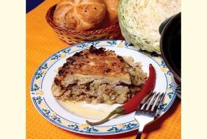 Varza se curata si se spala bine, apoi se pune la fiert, intreaga, in apa cu sare. Se fierbe 30 de minute, se taie fideluta, se scurge bine de apa si se caleste 10 minute in 100g untura. Ceapa, ardeiul gras, usturoiul si mararul se toaca marunt si se calesc 5 minute in untura ramasa, apoi se pun carnea, cimbrul si se mai calesc inabusit 10 minute. Se asaza intr-o cratita straturi de varza si carne cu legume, se incepe cu varza si se termina tot cu varza, se adauga bulionul diluat, 2 cani din zeama in care a fiert varza, se potriveste de sare si piper si se baga la cuptor pentru cca. o ora. Cu 5 minute inainte de a opri focul, se pun ouale batute, pe deasupra.