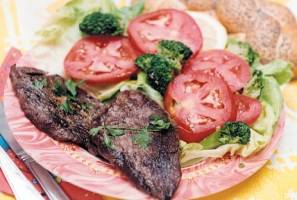 Se taie carnea in 8 felii mai groase si se bate putin cu ciocanul de snitele. Se unge apoi cu mustar pe ambele parti si se frige pe gratarul incins. Se scoate pe o farfurie calda, deasupra carnii se presara patrunjel verde, sare si piper, dupa gust, si se pune un cubulet de unt. Se serveste cu garnitura de cartofi si cu legume proaspete.