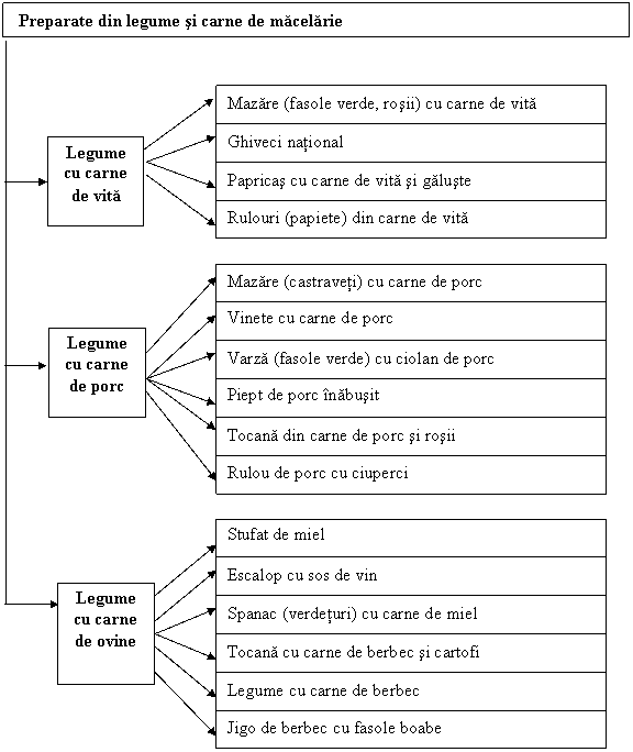 Precizati sortimentul preparatelor din legume si carne de macelarie.