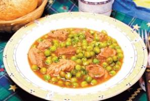 Ingrediente: 1kg piept de vitel, 1,5kg mazare congelata, 3 cepe, 1 lingura faina, 2 linguri zahar, 2 linguri bulion, 1.5 litri supa de vita (cub), 1 leg. marar, sare, piper