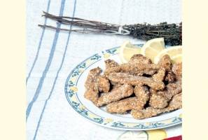 Curata pielea si taie carnea feliute groase de un deget si lungi de maximum 5 cm. Clateste-le cu apa rece si zvanta bucatelele intr-un servet de hartie. Amesteca bine intr-un castron sucul si coaja de lamaie, iaurtul, iar separat, intr-o farfurie intinsa, amesteca pesmetul cu boiaua, piperul, cimbrul si susanul. Inmoaie bucatelele de carne in acest sos si apoi da-le prin amestecul de pesmet. Le vei aseza intr-o tava de teflon si le vei pune la cuptor circa 40-60 minute pana puiul este bine patruns.