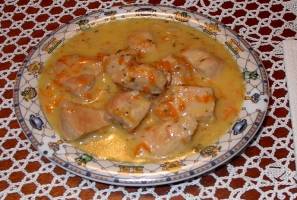 Ingrediente: un piept de pui, 2 cepe, 2 morcovi mai mici, jumatate de pachet unt, 100 ml smantana, 2 linguri faina, o lingura cimbru maruntit, 10 boabe piper, sare.