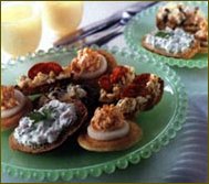 Prajiti 12 felii de paine neagra si ungeti-le cu un strat de smantana groasa. Asezati pe fiecare cate o felie subtire de ridiche neagra, iar peste ridiche cate o transa de somon afumat, 2 sardele in ulei sau 1/2 lingurita de icre rosii. Garnisiti-le cu sferturi de felii de lamaie taiate in doua sau in patru.