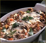 sosul. Se gusta de sare si piper. Se unge o forma (eventual de Jena), se toarna in ea ciupercile, iar peste ele se asaza branza taiata