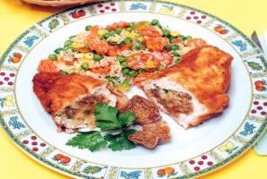 Ingrediente: 3 buc. piept de pui, 100g smochine, 100g cascaval, 6 frunze de salvie, 50g alune de padure, 3 oua, 100g faina, 150g pesmet, 300ml ulei, sare, piper