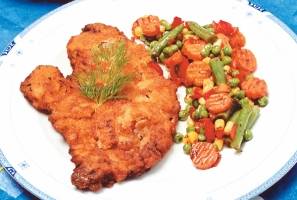 Ingrediente: 800g pulpa de vitel, 1 ardei iute, 2 kiwi, 1 ceapa mica, 1 lingura miere, 800g amestec mexican de legume, 2 oua, 3 linguri faina, 4 linguri pesmet, 200ml ulei, 100g unt, sare, piper