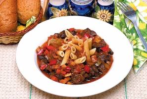 Ingrediente: 1kg spata de vitel, 250ml vin rosu, 100g masline negre, 2 ardei grasi (verde, rosu), 1 telina mica, 2 cepe mici, 2 morcovi potriviti, 2 catei de usturoi, 2 foi de dafin, 1 conserva rosii decojite in bulion, 150ml supa de vita (cub), 1 lingurita rasa busuioc uscat, 200g paste scurte, 50g unt, 1 leg. patrunjel, sare, piper
