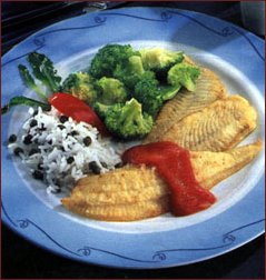 File de peste cu sos tomat Ingrediente: 750 g file de peste (congelat), 600 g broccoli (congelat), 1-2 linguri capere mici, 250 g orez, sare, 1 ceapa, 1 lingura ulei, 400 g bulion subtiat, piper,Citeste tot ... 195 cuvinte
