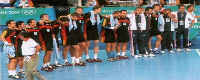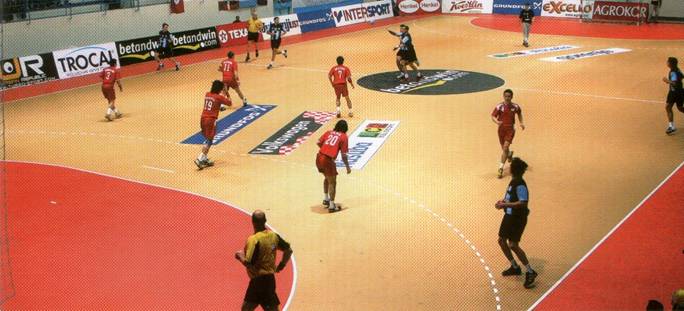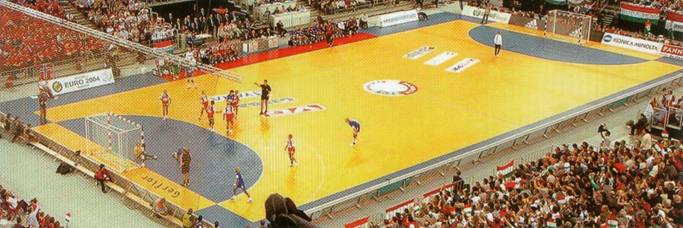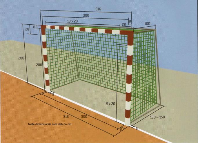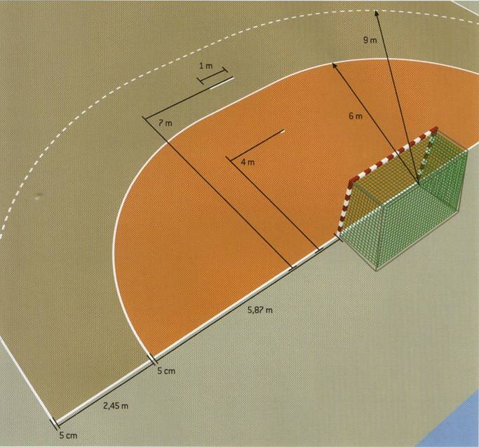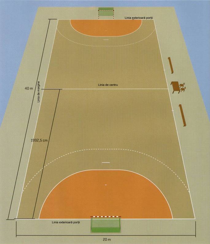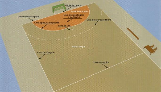In fata fiecarei porti exista un spatiu de poarta. Spatiul de poarta este delimitat de linia spatiului de poarta (linia de 6m), care se traseaza dupa cum urmeaza: a) o linie lunga de 3 metri in fata portii; aceasta linie este paralela cu linia de poarta, la o distanta de 6 metri de aceasta (masurati de la muchia posterioara a liniei de poarta pana la muchia anterioara a liniei spatiului de poarta) b) doua sferturi de cerc, fiecare avand raza de 6 metri (masurati de la coltul interior posterior al stalpilor portii), care fac legatura intre linia de 3 metri lungime si linia exterioara portii. Linia de aruncare libera (linia de 9m) este o linie punctata, aflata la 3 metri in afara spatiului de poarta. Atat segmentele componente ale linie, cat si spatiile dintre segmente masoara 15 cm. Linia de7m este o linie cu lungimea de 1 metru, paralela cu linia de poarta, la o distanta de 7 metri de aceasta (masurat de la muchia posterioara a liniei de poarta la muchia anterioara a liniei de 7m). Linia de limitare a portarului (linia de 4m) este o linie cu lungimea de 15 cm, paralela cu linia de poarta , la o distanta de 4 metri de aceasta (masurata de la muchia posterioara a liniei de poarta pana la muchia posterioara a liniei de 4m) Linia de centru uneste mijlocul liniilor de margine. Linia de schimb (un segment la linia de margine) pentru fiecare echipa, se intinde de la linia de centru pana la un punct aflat la distanta de 4.5 metri de aceasta. Acest punct al liniei de schimb este marcat de o linie paralela cu linia de centru si care se intinde pe o distanta de 15 cm inauntrul liniei de margine si 15 cm in afara liniei de margine. |