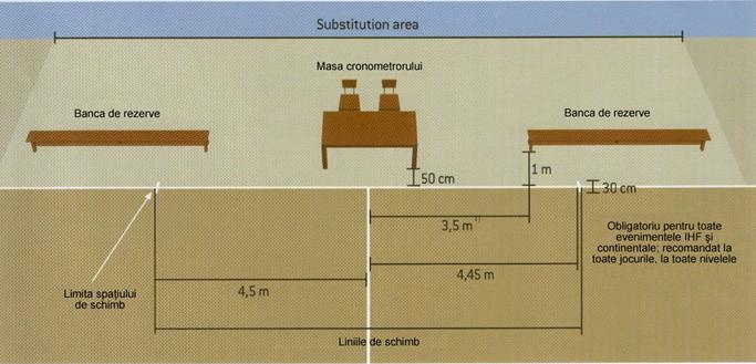 Un numar de maxim 4 oficiali si 7 jucatori de rezerva care au drept de participare la joc, si jucatorii care au primit o eliminare de 2 min. au voie sa stea in acest spatiu Jucatorii descalificati sau eliminati definitiv trebuie sa paraseasca aceasta zona |