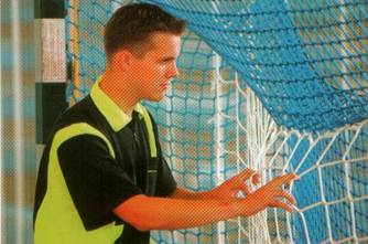 Muchia din spate a barelor portilor trebuie aliniate cu muchia exterioara a liniei de poarta. Portile trebuie sa fie bine fixate de podea (pentru a preveni accidentele!)