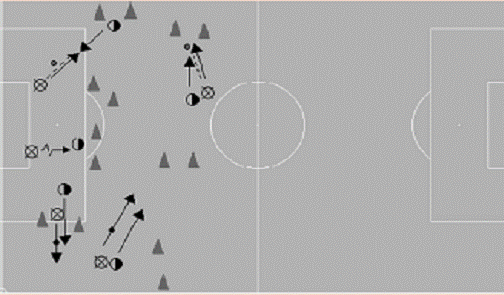 Perechi tehnice cu acelasi grad de performanta joaca 1 contra 1 pe terenul de joc, pe care sunt impartite mici porti, formate din jaloane. Se poate folosi fiecare poarta. In cazul in care apar deficiente la tempo-ul dribling-ului (mod incorect de tinere a piciorului, mingea sare prea departe, s.a.m.d.), ar putea fi introduse, dupa discutarea cu copii, urmatoarele forme de exercitii: