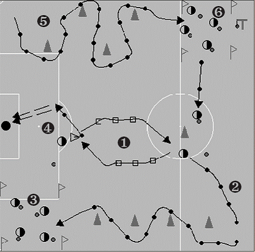 Pe terenul de joc sunt asezate mai multe, asa numite, porti duble, aceasta inseamna 3 porti mici din jaloane stabile care se afla pe aceeasi linie, la o distanta de 3 m una de cealalta. Fiecare jucator detine o minge si executa urmatoarele exercitii la diferite porti duble.