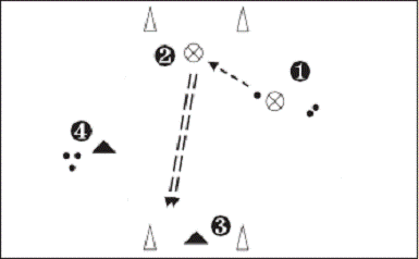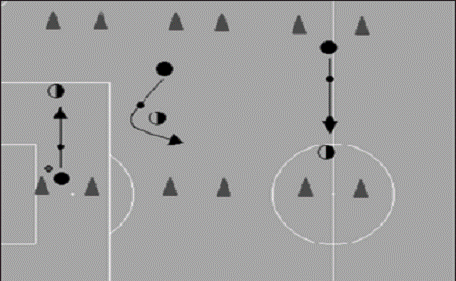 Partenerii joaca acum 1 contra 1 pe doua porti mici din jaloane stabile, care se afla la o distanta de circa 20 m unul de celalalt. Jucatorul care detine mingea porneste de pe linia propriei porti, avand voie sa fie atacat abia la jumatatea parcursului sau, adica atacantul vine in viteza spre aparator, rezolvand individual situatia creata, de a recupera mingea de la aparator, pentru a putea suta la poarta.