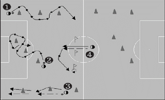 Dupa un dribling usor, se va juca mingea de la o distanta de cca. 5 m, peste o linie de poarta a portilor duble. Jucatorul va sprinta dupa aceasta, va controla intr-un mod cat mai rapid posibil mingea si va inconjura toate cele 3 porti cu mingea, alternand directiile, aceasta insemnand, o data spre dreapta si o data spre stanga.