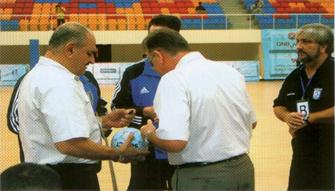 Arbitrii aleg mingea de joc si mingile de rezerva. |