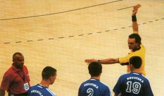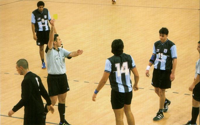 In competitiile IHF, arbitrii nu trebuie sa aiba cronometru (pentru ca timpul de joc este verificat de catre delegatul tehnic); ei trebuie sa isi noteze doar avertismentele.