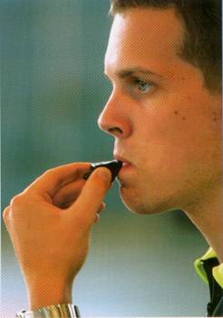 Arbitrul ia contact vizual cu cronometrorul (totul este ok?) si fluiera reluarea jocului. Cronometrorul porneste ceasul oficial. |