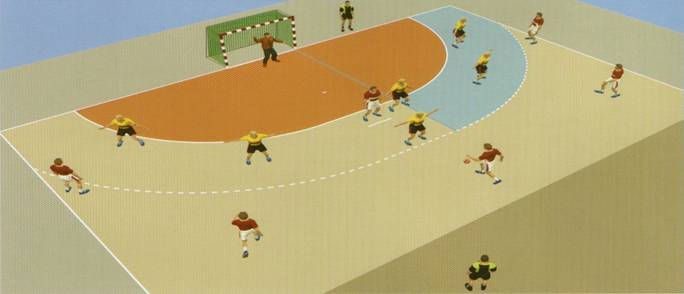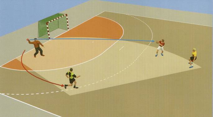 Prima repriza (la fel a si a doua) se incheie cu semnalul de final de repriza. Nu este neregulamentar ca acest semnal sa se auda inainte ca o aruncare sa fie executata (de ex. o aruncare libera sau o aruncare de la 7m). O data cu auzirea semnalului de final, arbitrii trebuie sa fluiere executarea aruncarii. Jocul nu ia sfarsit pana cand rezultatul aruncarii nu este clar. Arbitrii fluiera apoi sfarsitul reprizei sau al jocului.