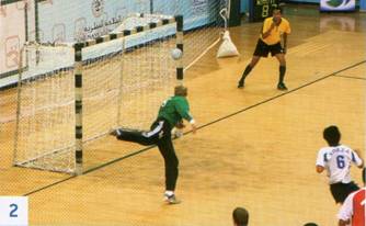 Nota: Daca portarul atinge mingea sau o respinge, arbitrii trebuie sa astepte rezultatul final al actiunii (daca este sau nu gol). Atingerea sau devierea mingii nu sunt considerate rezultate ale aruncarii, pentru ca mingea se poate respinge din bara in gol, de exemplu. Arbitrii pot incheia jocul abia dupa ce se cunoaste rezultatul final al aruncarii (2:4). |