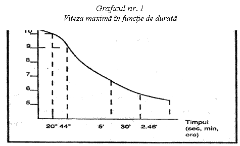 De altfel, viteza (a nu se intelege viteza maxima) se gaseste in stransa corelatie cu tipul de energie mobilizat. Ea atinge cota maxima spre 20 secunde din cursa (aproximativ 200m), ceea ce corespunde cu metabolizarea componentelor de fosfati bogate in energie, respectiv ATP-ul si CP-ul. Ea poate, dupa aceea, sa se mentina la un inalt nivel, in timpul efortului maximal, pana la aproximativ 50 sec. (ceea ce corespunde cu proba de 400m) si unde glicoza anaeroba se gaseste la punctul sau maxim. In final, ea se reduce sensibil odata cu marirea duratei si instalarea progresiva a mecanismelor aerobe de aprovizionare cu energie.