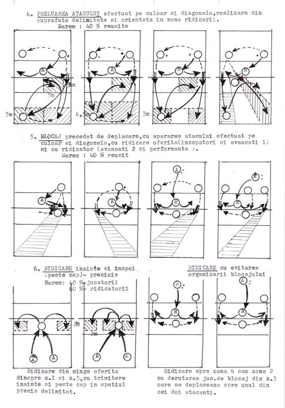 - ideea implicarii jucatorilor in joc este aceea a valorificarii maximului randament in cadrul sistemului cu 5 tragatori si 1 ridicator in atacul bazat pe viteza de construire combinativa a actiunilor cu intrarea ridicatorului din toate zonele la preluarea serviciului si cu participarea la finalizarea in 3 momente succesive (de "baza", "surpriza" si "siguranta" ) a tragatorilor din linia I si a-II-a;