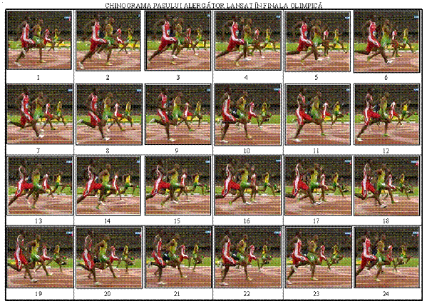 Alergarea pe parcurs - este aproape perfecta. Desi ceilalti finalisti sunt alergatori foarte buni 10,03 locul 8, diferentele sunt totusi evidnte. In primul rand inaltimea alergarii ii permite reaizarea celui mai apropiat contact solul in raport cu proiectia pe sol a (C.G.G.) (fotograme 8 si 9 din chinograma)