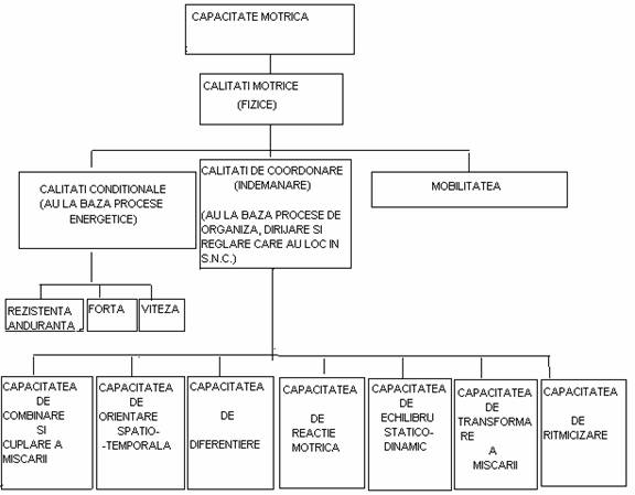 Subordonate acestor capacitati fundamentale sunt : capacitatea de orientare spatiala ; capacitatea de diferentiere kinestezica ; capacitatea de reactie ; capacitatea de ritm ; capacitatea de echilibru.