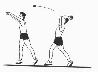 cu un brat inapoi si pe deasupra capului brate, inainte.