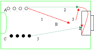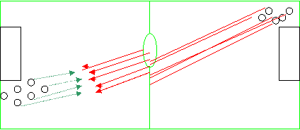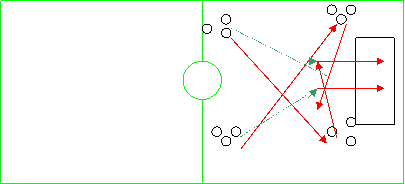 2.Aceeasi asezare a jucatorilor , se paseaza pe diagonala celalalt preia, conduce spre coltul terenului , centreaza , iar cel care a pasat pe diagonala finalizeaza din prima(fara preluare).
