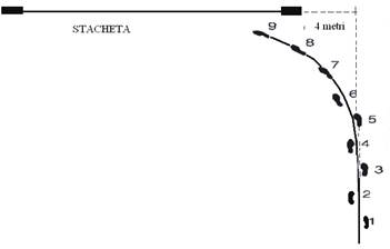 - elan de 3-5 pasi rectiliniar, urmat de inca 3-5 pasi efectuati pe un traseu curb, aceeasi raza, bataie, intoarcere cu 900, aterizare pe locul desprinderii, liber si in fata stachetei.