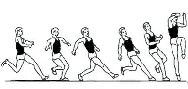 - succesiune de pasi saltati, cu desprindere numai de pe piciorul de bataie, avantarea cu piciorul de atac in diagonala spre cel de bataie si cu ambele brate;