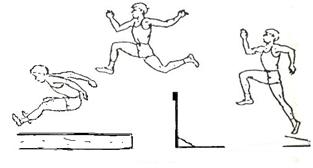 - elan de 3-5 pasi, 7-9 pasi, sarituri pe diferite obiecte (se prefera lada de gimnastica), cu aterizare pe piciorul de avantare. Coborarea de pe obstacol se realizeaza pe piciorul de bataie cu continuarea alergarii. Inaltimea obstacolului 40-60-80-100cm, in functie de varsta si nivelul de pregatire. De asemenea si lungimea elanului va creste, in functie de aceste criterii;