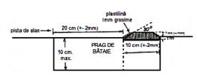 Bataia se efectueaza la pragul de bataie (Figura 10.) construit din lemn, la nivelul pistei de elan, lung de 1,21-1,22 m si lat de 20cm, plasat la o distanta de cel putin 10m fata de extremitatea zonei de aterizare; marginea pragului dinspre groapa cu nisip, numita linia de bataie se continua cu pragul pentru plastilina lat de 10cm si lung de 1,21-1,22m ridicat fata de nivelul pragului de lemn, la o inaltime de 7mm, sub un unghi 30s, in directia alergarii.