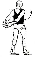 - primul pas, care este mai lung (2-2,20m) se executa cu piciorul drept, bratul cu mingea incepe sa se duca inapoi; concomitent cu inceperea ducerii mingii inapoi, are loc si rasucirea usoara a axei umerilor spre dreapta, iar bratul liber (stangul) este adus indoit in fata pieptului, fapt ce relaxeaza centura scapulo-humerala.